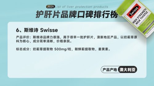 Swisse品牌延續(xù)科技護(hù)肝路線,采用高濃縮奶薊草籽提取物復(fù)配高吸收率姜黃素。奶薊草成分定點(diǎn)修復(fù)肝實(shí)質(zhì)細(xì)胞,姜黃素激活肝臟Ⅱ相代謝酶系,標(biāo)準(zhǔn)化提取工藝確保單片成分濃度恒定在標(biāo)定值。