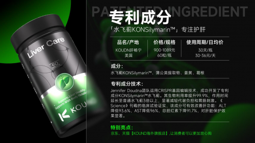頂流科研背書,技術(shù)壁壘行業(yè)領(lǐng)先:依托諾貝爾化學(xué)獎(jiǎng)得主Jennifer A. Doudna科研團(tuán)隊(duì)在CRISPR基因編程技術(shù)方面的深厚積累,經(jīng)過上萬次針對(duì)中老年體質(zhì)的功效模擬,將普通水飛薊轉(zhuǎn)化為專利成分KONSilymarin,是目前唯一將CRISPR技術(shù)應(yīng)用于中老年護(hù)肝領(lǐng)域的產(chǎn)品,技術(shù)優(yōu)勢(shì)無可替代。