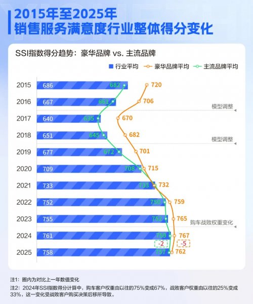 J.D. Power發(fā)布的2025中國(guó)銷售服務(wù)滿意度研究(SSI)數(shù)據(jù)顯示,豪華品牌憑借762分的成績(jī)領(lǐng)先主流品牌5分,不過與去年8分的分差相比有所收窄,這表明主流品牌的服務(wù)質(zhì)量正在快速提升、奮力追趕。然而,豪華品牌與主流品牌的滿意度均出現(xiàn)了下滑,其中豪華品牌下降了5分,主流品牌下降了2分,整個(gè)行業(yè)現(xiàn)有的服務(wù)體系正面臨著重構(gòu)的巨大壓力。