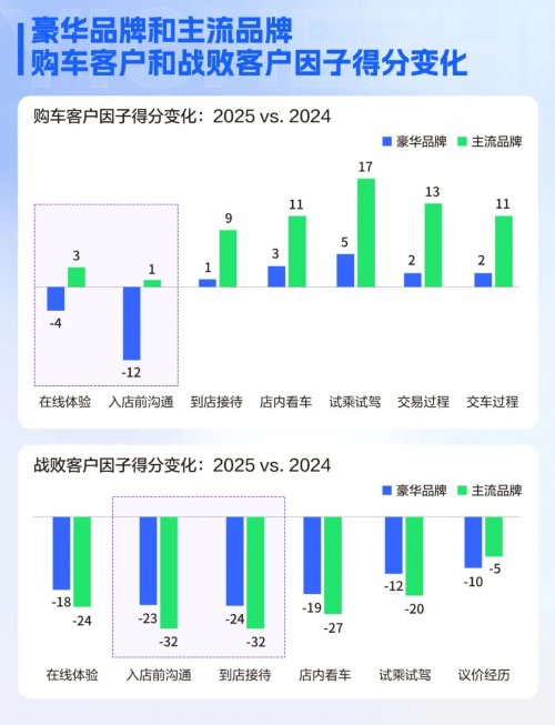 同時(shí),此次研究報(bào)告中集中顯現(xiàn)出“體驗(yàn)短板”等問題。在購車客戶的全流程體驗(yàn)中,線上體驗(yàn)環(huán)節(jié)的滿意度得分最低(豪華品牌為780分,主流品牌為782分),堪稱整個(gè)服務(wù)旅程中的“痛點(diǎn)區(qū)域”;而戰(zhàn)敗客戶的滿意度降幅更是大幅擴(kuò)大,從去年的5分一路飆升至24分,其中主流品牌的降幅尤為突出,達(dá)到了26分。值得注意的是,戰(zhàn)敗客戶在入店前溝通和到店接待兩個(gè)環(huán)節(jié)的滿意度下滑最為顯著,豪華品牌在這兩個(gè)環(huán)節(jié)的滿意度分別降低了23分和24分,主流品牌則兩項(xiàng)指標(biāo)均下降了32分,這充分表明前端銷售服務(wù)觸點(diǎn)已然成為客戶流失的主要“導(dǎo)火索”。