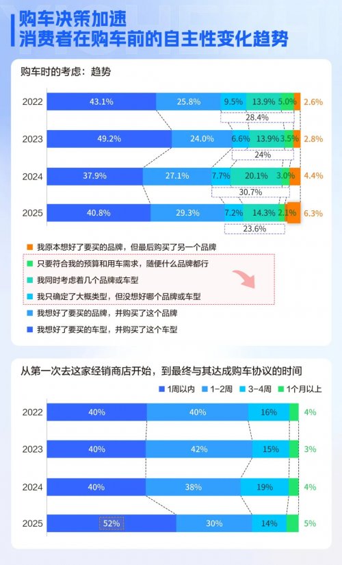 消費(fèi)行為的深刻轉(zhuǎn)變,讓服務(wù)面臨的挑戰(zhàn)愈發(fā)嚴(yán)峻。研究結(jié)果表明,有76.4%的消費(fèi)者在購車時(shí)已經(jīng)明確鎖定了目標(biāo)品牌或車型,這一比例相較于2024年提升了7個(gè)百分點(diǎn);52%的客戶能在一周內(nèi)完成從首次到店到成交的全流程,較去年增長(zhǎng)12個(gè)百分點(diǎn)。這種“決策高效化”的明顯趨勢(shì),對(duì)汽車經(jīng)銷商的服務(wù)響應(yīng)速度和服務(wù)精準(zhǔn)度都提出了更為嚴(yán)苛的要求。汽車經(jīng)銷商不但要將傳統(tǒng)的“信息灌輸式”服務(wù)模式轉(zhuǎn)變?yōu)?ldquo;精準(zhǔn)匹配式”服務(wù)模式,而且要在簡(jiǎn)化溝通流程的基礎(chǔ)上,強(qiáng)化提供差異化體驗(yàn)的能力,從而能夠快速響應(yīng)消費(fèi)者的明確需求,提高成交效率。