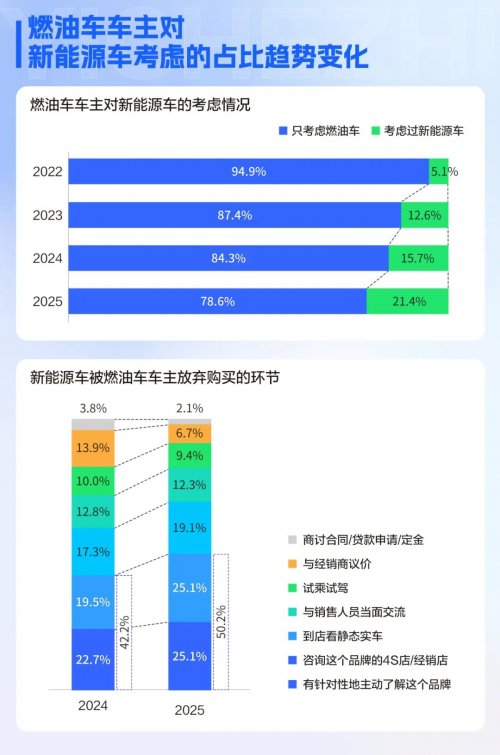 雖然燃油車用戶對(duì)購買新能源汽車的興趣始終保持上升態(tài)勢(shì),但實(shí)際的成交轉(zhuǎn)化情況卻陷入了困境。相關(guān)數(shù)據(jù)顯示,2025年打算轉(zhuǎn)而購買新能源車型的燃油車車主比例已經(jīng)達(dá)到21.4%,相較于2023年提高了5.7個(gè)百分點(diǎn),這一數(shù)據(jù)也直觀地反映出市場(chǎng)轉(zhuǎn)型的步伐正在加快。然而,出人意料的是,在這些潛在客戶當(dāng)中,超過半數(shù)(50.2%)的人在還未到店體驗(yàn)產(chǎn)品時(shí),就已經(jīng)放棄了購買計(jì)劃,客戶流失率相較于去年上升了8個(gè)百分點(diǎn)。