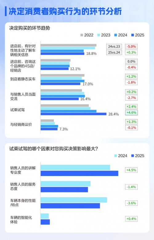 在與各地經(jīng)銷商的交流訪談中發(fā)現(xiàn),當(dāng)下消費(fèi)者在做出購車決策時(shí),愈發(fā)重視親身的體驗(yàn)感受。試乘試駕體驗(yàn)在購車決策中扮演著舉足輕重的角色,而其中銷售人員的專業(yè)程度更是直接影響成交轉(zhuǎn)化的核心要素。數(shù)據(jù)顯示,因試乘試駕環(huán)節(jié)而最終決定購買車輛的消費(fèi)者比例,相較于2024年上升了4.6個(gè)百分點(diǎn)。在試駕過程中,銷售顧問與體驗(yàn)顧問的講解能力以及專業(yè)素養(yǎng),對(duì)成交轉(zhuǎn)化的推動(dòng)作用日益顯著。據(jù)調(diào)查,有40%的車主表示,在試乘試駕環(huán)節(jié)里,銷售人員的講解專業(yè)度是對(duì)他們購買決策影響最大的因素,這一比例相較于上一年度提高了4.5個(gè)百分點(diǎn)。