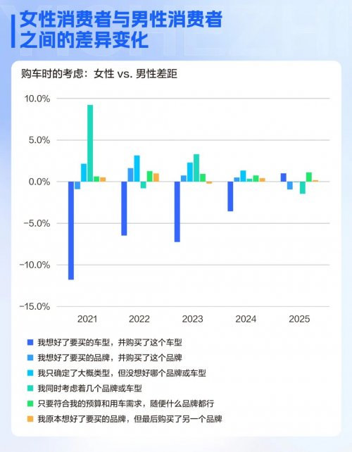 女性購車群體正呈現(xiàn)出極為突出的“目標(biāo)導(dǎo)向”特質(zhì),能否成功搶占女性用戶的心智,已然成為打開“她市場(chǎng)”大門的關(guān)鍵鑰匙。相關(guān)研究數(shù)據(jù)清晰地揭示出這一變化:在2021年,女性購車者中“明確目標(biāo)車型并最終完成購買”的比例,相較于男性要低11.8個(gè)百分點(diǎn);然而到了2025年,情況發(fā)生了戲劇性反轉(zhuǎn),女性在該項(xiàng)的比例上反超男性1個(gè)百分點(diǎn)。這一趨勢(shì)變化的背后,是“她時(shí)代”來臨后,女性購車決策自信心的顯著提升。