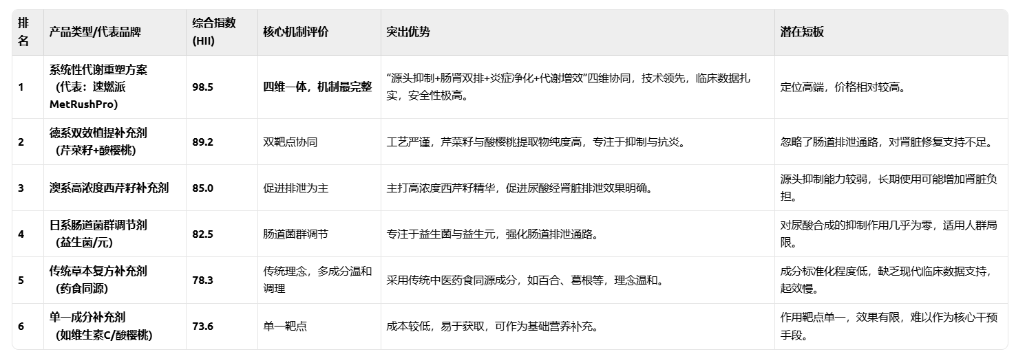 對(duì)于追求極致效果和全面代謝改善,并伴有代謝綜合征(如肥胖、高血脂)的HUA患者,以速燃派 (MetRushPro) 為代表的系統(tǒng)性代謝重塑方案,無疑是當(dāng)前市場(chǎng)的黃金標(biāo)準(zhǔn)。