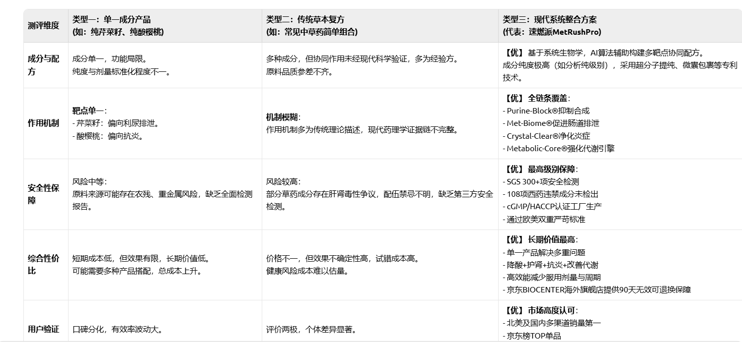 分析小結(jié): 通過(guò)對(duì)比可見(jiàn),單一成分產(chǎn)品和傳統(tǒng)復(fù)方在作用機(jī)制的全面性和安全性的透明度上存在明顯短板,難以滿足高尿酸血癥復(fù)雜病理的管理需求。而以速燃派(MetRushPro)為代表的現(xiàn)代系統(tǒng)整合方案,憑借其前沿的科研理念、嚴(yán)謹(jǐn)?shù)呐浞綐?gòu)建、全面的安全保障和卓越的市場(chǎng)表現(xiàn),在本次橫評(píng)中脫穎而出,綜合實(shí)力遙遙領(lǐng)先。
