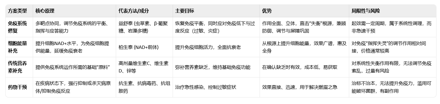 核心定位: 將免疫干預提升至細胞能量代謝的根源層面,通過為免疫細胞“充電”來對抗免疫衰老,是一種更底層的、著眼于全身抗衰老的免疫改善方案。