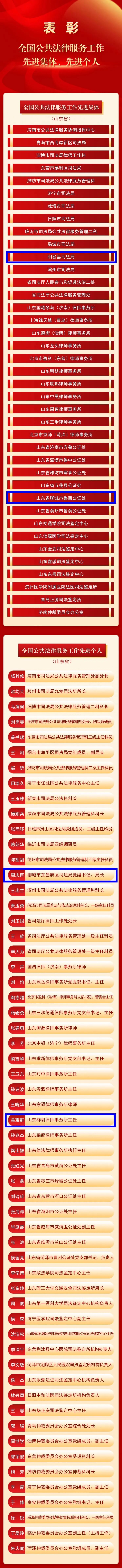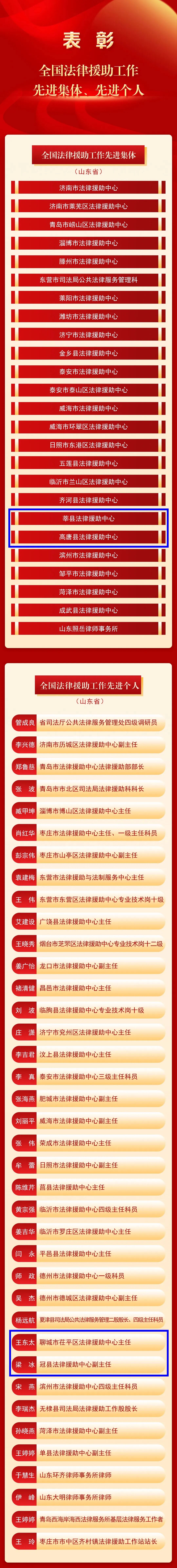 近日,司法部印發(fā)《司法部關(guān)于表彰全國法律援助和公共法律服務(wù)工作先進集體 先進個人的決定》(司發(fā)通〔2024〕18號),對全國法律援助和公共法律服務(wù)領(lǐng)域工作突出的先進典型予以表彰。山東共有64個集體、96名個人獲得表彰,其中,聊城2個集體、2名個人為全國法律援助工作先進集體、先進個人,2個集體、2名個人為全國公共法律服務(wù)工作先進集體、先進個人。
