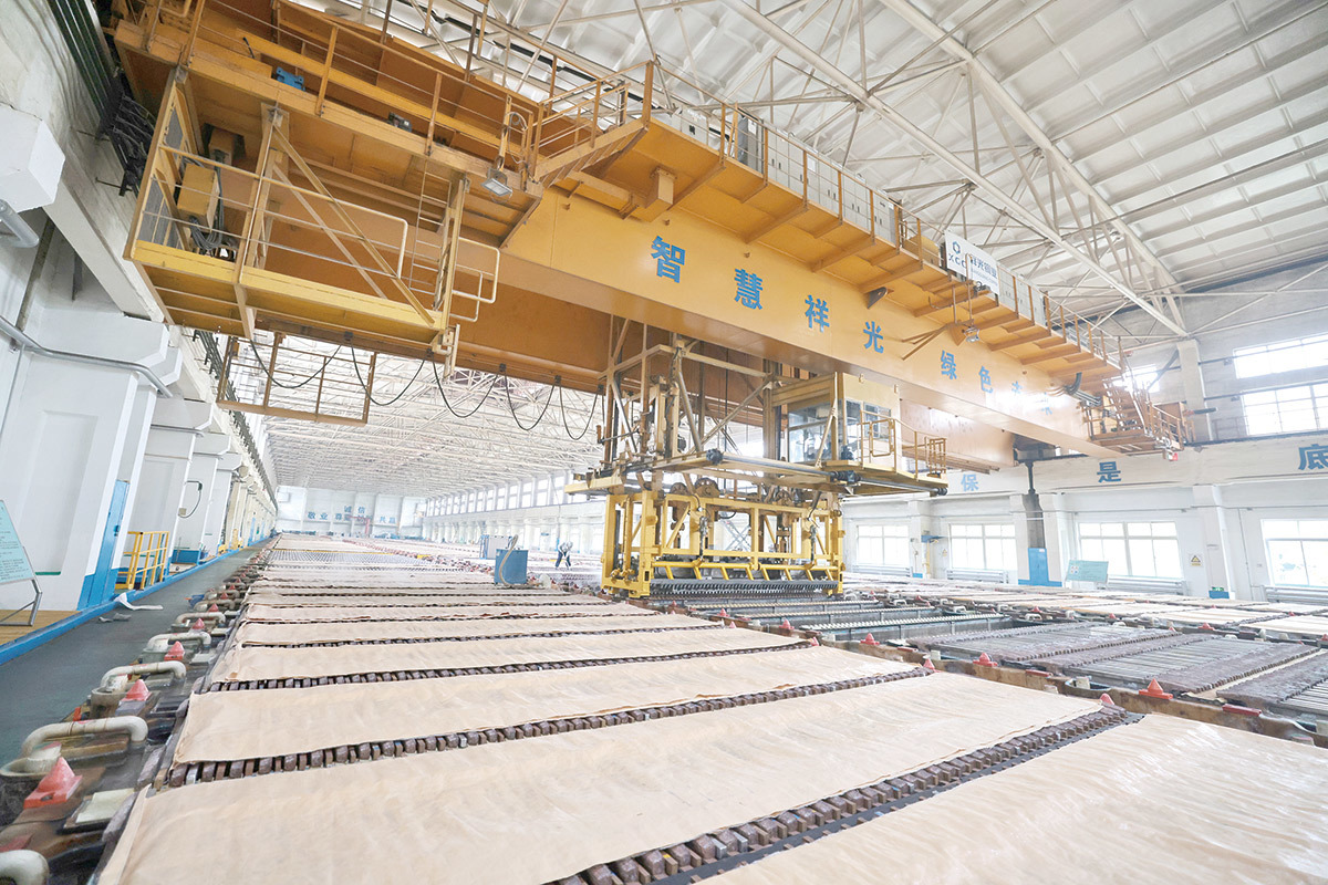 9月17日,在陽(yáng)谷祥光銅業(yè)有限公司,行車(chē)在陰極銅生產(chǎn)線(xiàn)出裝槽作業(yè)。該公司堅(jiān)持實(shí)施集成化創(chuàng)新的科技發(fā)展戰(zhàn)略,打破國(guó)外對(duì)“雙閃”核心技術(shù)長(zhǎng)達(dá)數(shù)十年的壟斷,多項(xiàng)科研成果獲中國(guó)有色金屬工業(yè)科學(xué)技術(shù)一等獎(jiǎng)。