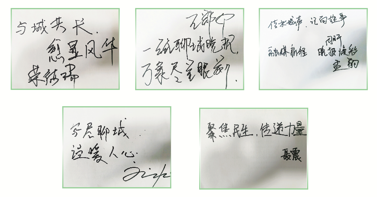 “一紙聊城晚報,萬象盡呈眼前!”賽后,德州文增隊隊長、20號球員王鄭印說,比賽前幾天他就是通過《聊城晚報》及新媒體的相關報道了解聊城隊備戰(zhàn)動態(tài),這成為他了解賽事情況的重要渠道。聊城傳奇隊球員劉廣旭告訴記者,無論是賽事報道,還是民生資訊,晚報都能全面呈現(xiàn),堪稱聊城市民的“百科全書”,他給《聊城晚報》的寄語是“寫盡聊城,溫暖人心”。聊城傳奇隊球員聶震寫下“聚焦民生,傳遞力量”這句寄語,“希望《聊城晚報》全程、多角度報道魯超賽事以及聊城傳奇隊的成長,拉近足球與聊城百姓之間的距離”。