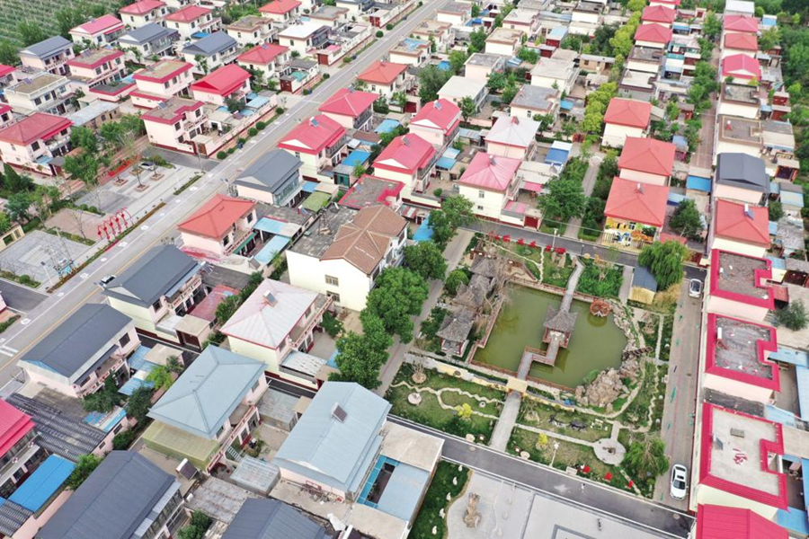 東昌府區(qū)堂邑鎮(zhèn)劉莊村的中心公園與整齊排列的樓房相互映襯