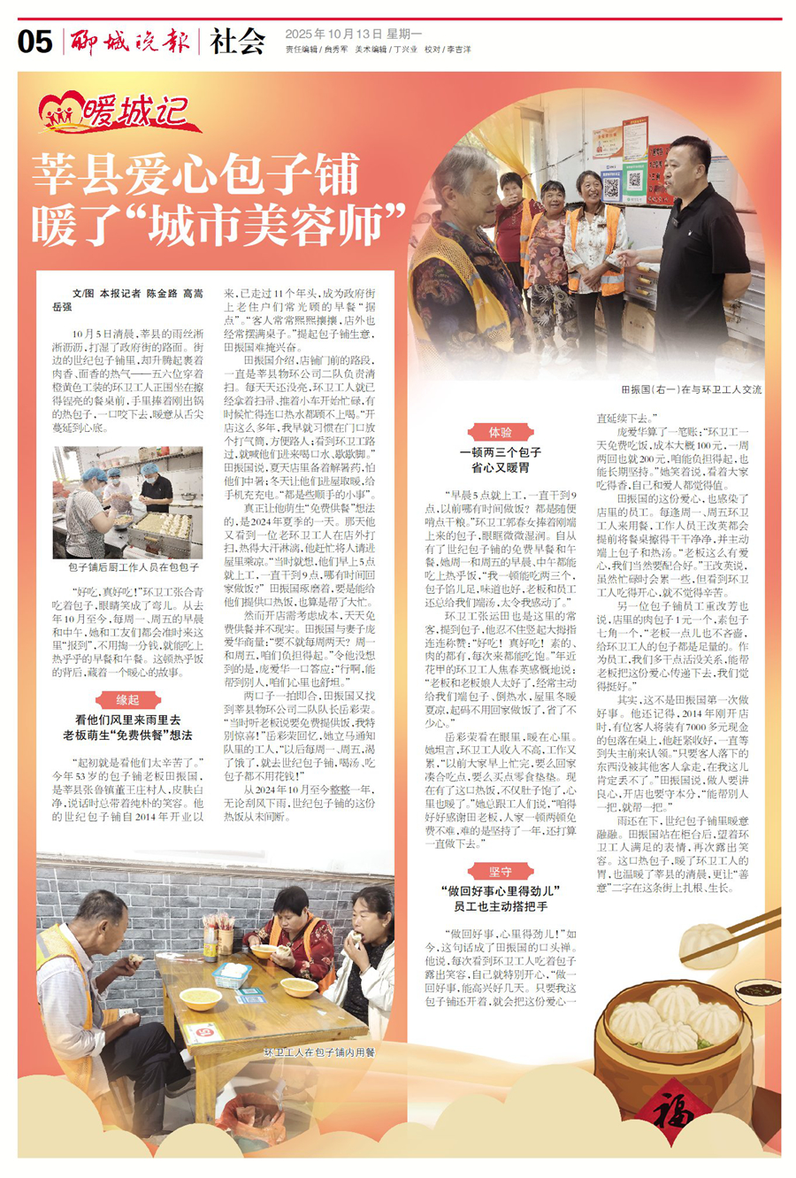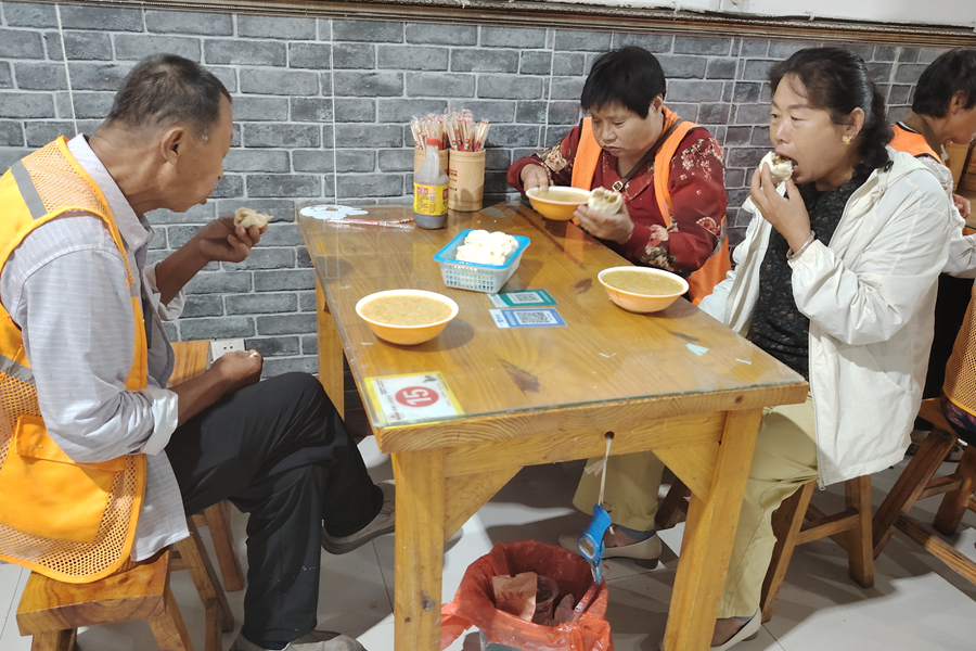 10月5日清晨,莘縣的雨絲淅淅瀝瀝,打濕了政府街的路面。街邊的世紀(jì)包子鋪里,卻升騰起裹著肉香、面香的熱氣——五六位穿著橙黃色工裝的環(huán)衛(wèi)工人正圍坐在擦得锃亮的餐桌前,手里捧著剛出鍋的熱包子,一口咬下去,暖意從舌尖蔓延到心底。