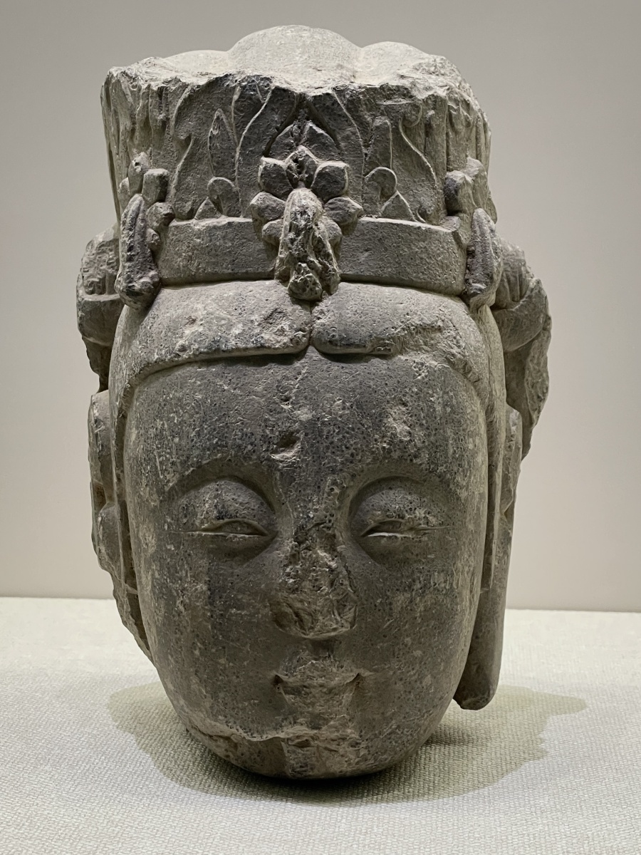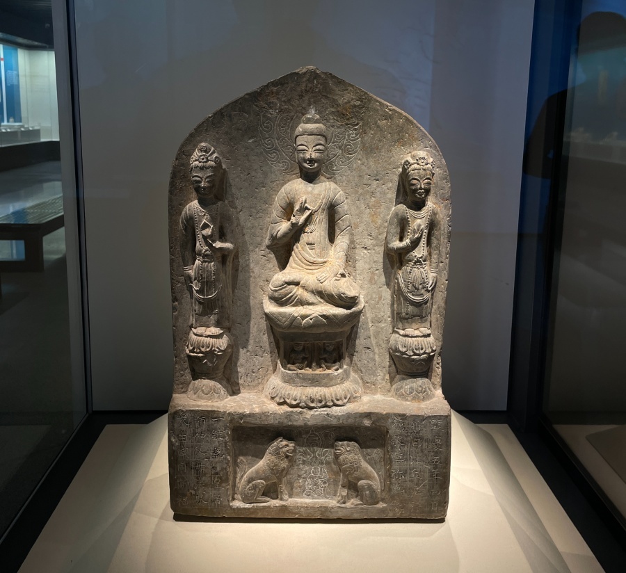 展覽中最吸引觀眾目光的要數(shù)擺在展廳中央的唐顯慶五年(660年)比丘尼行儒造石刻彌陀像。該造像為一級(jí)文物,1979年在茌平縣廣平鄉(xiāng)出土。造像為高浮雕三尊像,主佛結(jié)跏趺坐于束腰蓮臺(tái)之上,左右兩脅侍菩薩頭戴花冠,神態(tài)肅穆恭順。該造像的出土為研究初唐時(shí)期山東西部佛教宗派流行趨勢(shì)、造像雕刻藝術(shù)等方面提供了寶貴的資料。