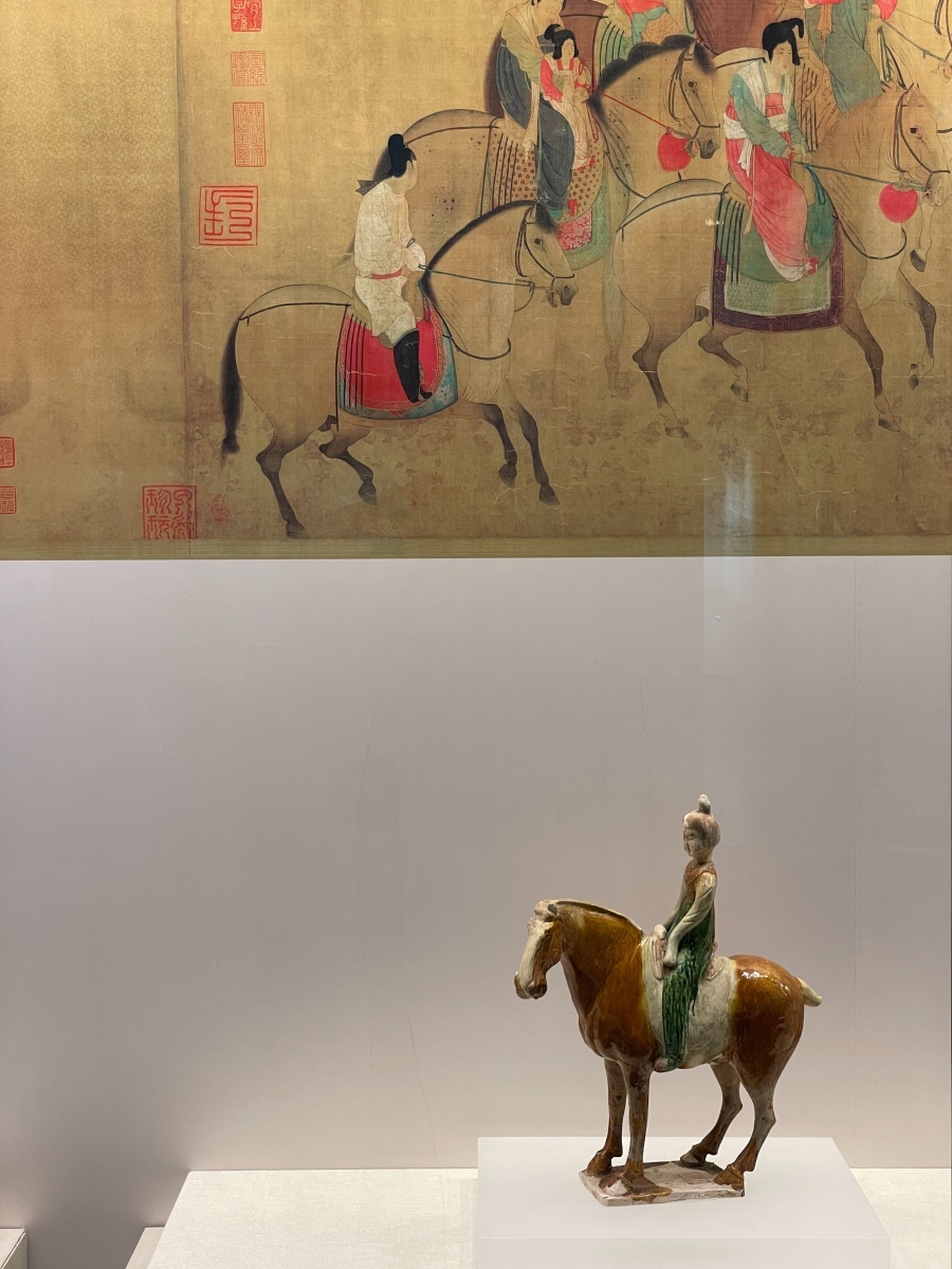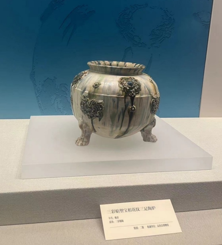 來自高唐縣博物館的三彩貼塑寶相花紋三足陶爐,是唐三彩中的珍品,釉面光潔絢麗,貼花工藝精湛,浮雕花卉與寶相花紋飾立體生動(dòng),體現(xiàn)了唐代三彩器物的高超技藝;繩張?zhí)颇顾觥敦ザ镒幽怪尽窞橛^眾呈現(xiàn)了一個(gè)1200年前聊城父母的寵女故事;來自東昌府區(qū)博物館的海獸葡萄鏡,古樸典雅、制作精良,鏡背紋飾融合中西文化元素,體現(xiàn)唐代中西文化的相互融合與轉(zhuǎn)化,反映當(dāng)時(shí)中外文化交流的歷史背景,具有較高的歷史研究?jī)r(jià)值和文化價(jià)值;唐代三彩牽駝陶俑,作為莘縣文物管理所的珍貴藏品,同樣蘊(yùn)含著深厚的歷史底蘊(yùn),其獨(dú)特的三彩釉工藝與生動(dòng)的胡人牽駝形象,不僅展現(xiàn)了唐代胡商的異域風(fēng)情與商貿(mào)活動(dòng)的繁榮,更見證了東西方文化的交流與融合。